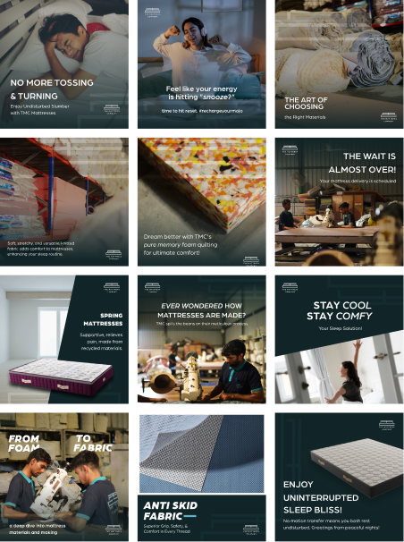 On social media, we crafted a content strategy centered around education, lifestyle integration, and product transparency. The communication tone was kept clear, confident, and informative — helping customers understand materials, benefits, and sleep science in a simplified manner. Visually, we maintained a clean and modern aesthetic that reinforced the brand’s clarity-driven positioning. The digital presence was designed to feel fresh, reliable, and aligned with the everyday consumer’s journey toward better sleep.