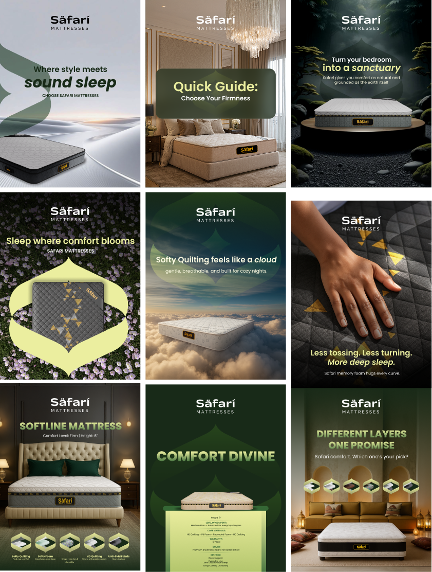 On social media, we repositioned Safari Mattresses as a confident, relatable, and knowledge-driven sleep brand. The content strategy focused on product education, comfort storytelling, manufacturing transparency, and customer-centric messaging. We developed a tone that felt warm yet assured — blending emotional connection with technical clarity. Visually, the feed was designed to feel clean, cozy, and premium, reinforcing the brand’s promise of reliable comfort while building stronger engagement with a modern digital audience.