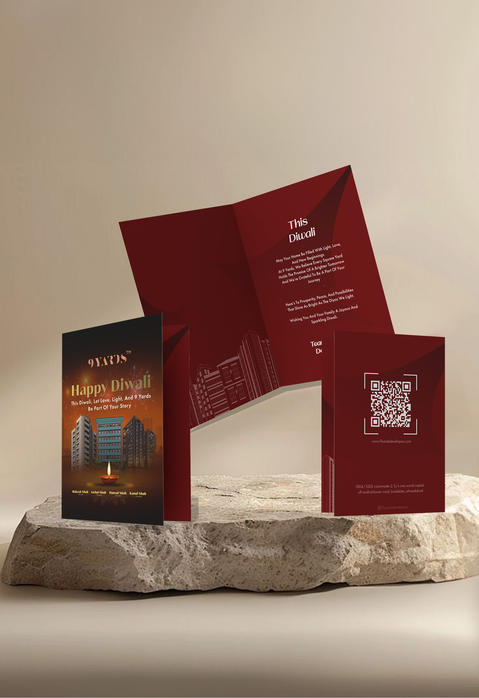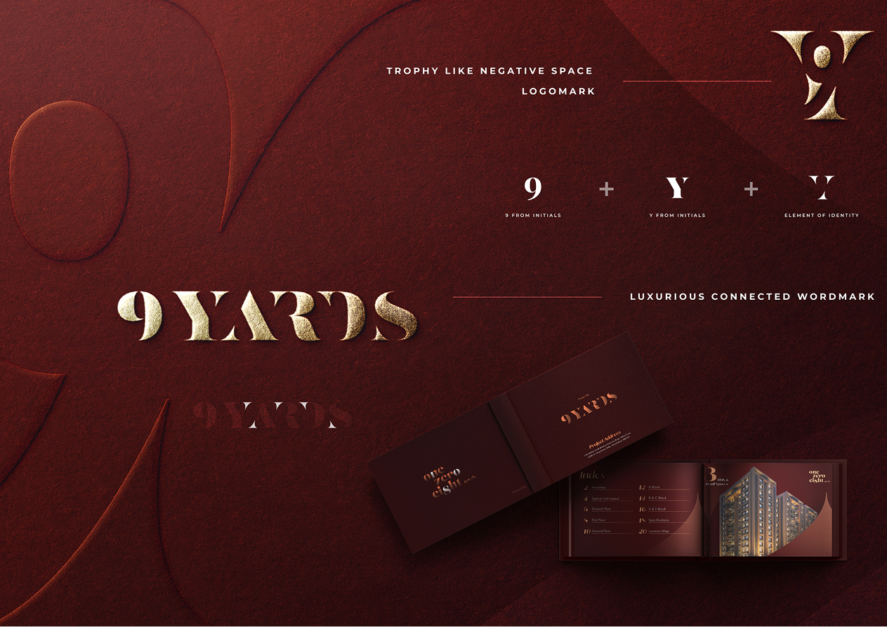 For 9 Yards Developers, we built a branding system that felt as complete and premium as the promise behind their name. The logo was thoughtfully constructed using negative space to integrate the ‘9’ within the ‘Y,’ creating a distinctive mark that subtly resembles a trophy — symbolizing aspiration and success. We developed a warm, luxurious color palette inspired by wood, leather, and rose gold tones, paired with bold serif typography to establish a refined and confident presence. From there, we translated the identity into a cohesive visual language, ensuring that every brand expression felt consistent, minimal, and upscale. The simplicity of the core elements allowed the brand to extend seamlessly across various collaterals, maintaining elegance, clarity, and a strong architectural character at every touchpoint.