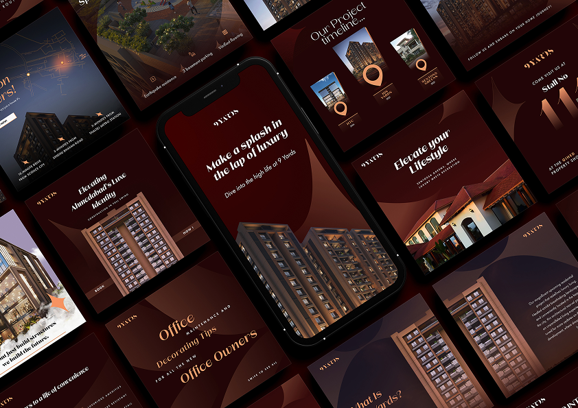 For social media, we translated the brand’s luxury positioning into a visually rich yet minimal digital presence. The tone was aspirational but grounded, reflecting confidence without being loud. We focused on showcasing architectural aesthetics, premium lifestyle cues, and structured compositions that mirrored the geometric strength of the logo. The warm color tones and refined typography were consistently carried through, ensuring that every post felt aligned with the larger identity. The goal was to create a feed that didn’t just promote projects — but reinforced 9 Yards as a symbol of achievement and elevated living.